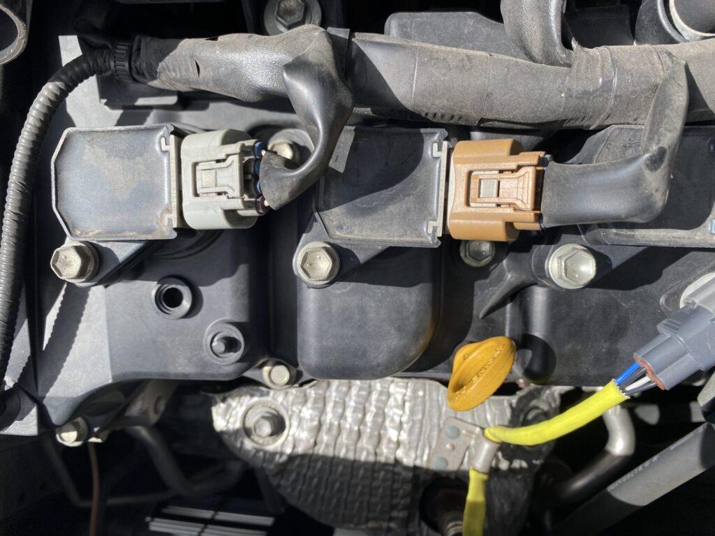 ミライースのボンネットを開けると、プラグコードが3本出てきます。